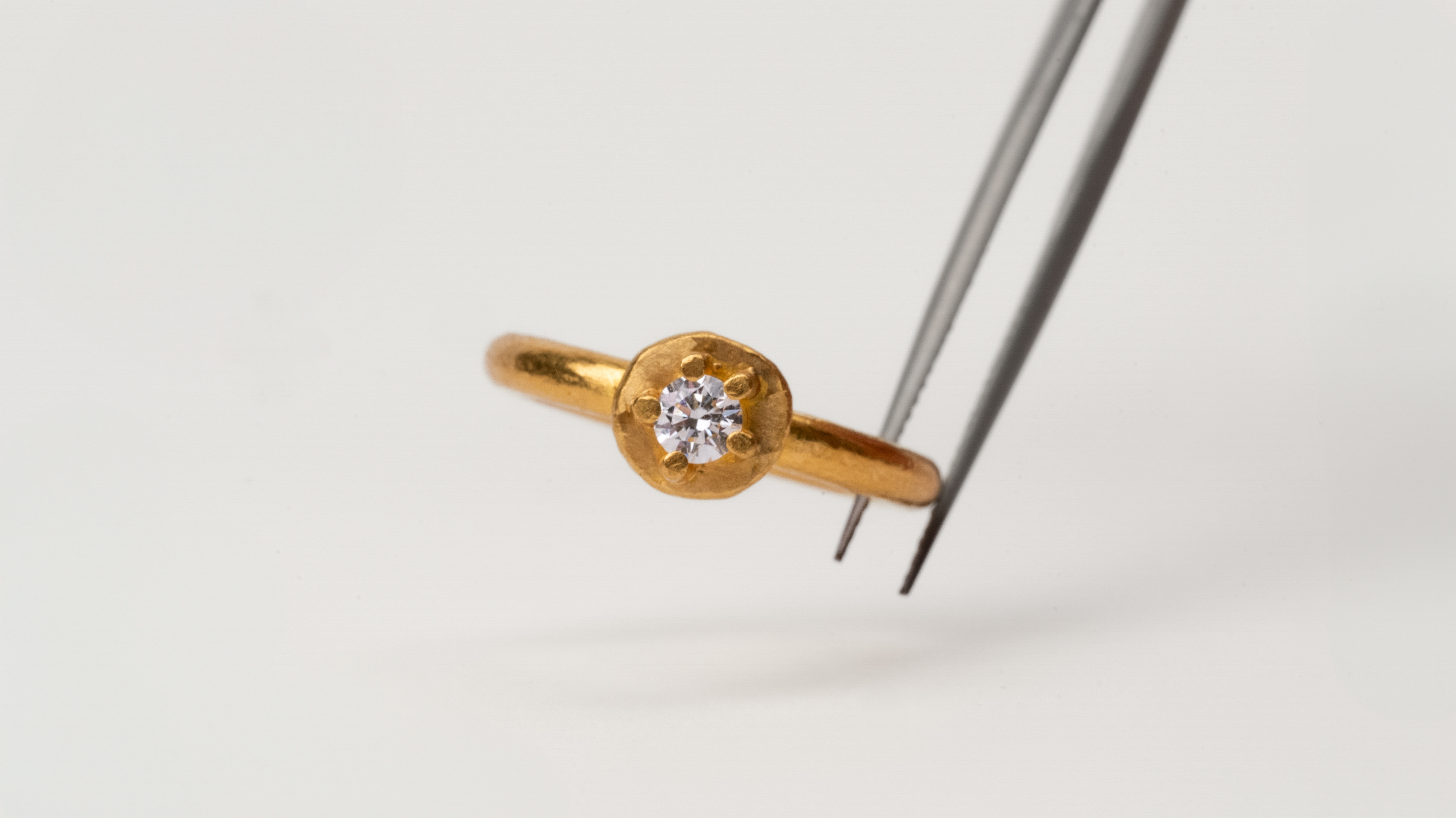 A 24-karat gold ring featuring a single diamond held in a prong setting. The softly matte surface accentuates the metal’s natural warmth, while the refined form recalls the harmony of ancient goldsmithing.